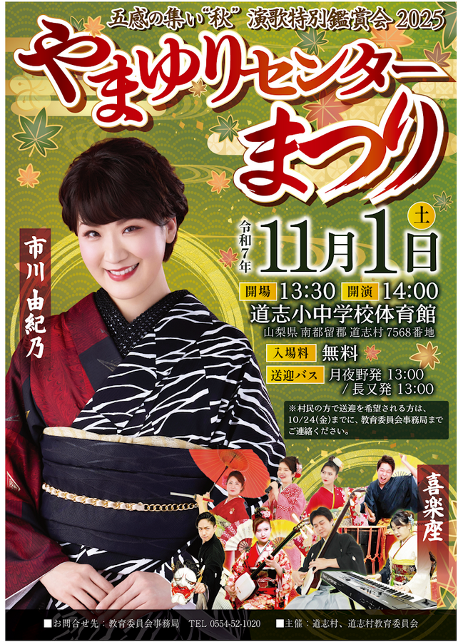 イベント名:やまゆりセンターまつり日程:2025年11月1日(土)場所:道志小中学校体育館 山梨県南都留郡道志村7568番地入場:無料送迎バス:月夜野発:13:00 / 長又発 13:00お問合せ先:教育委員会事務局 TEL:0554-52-1020